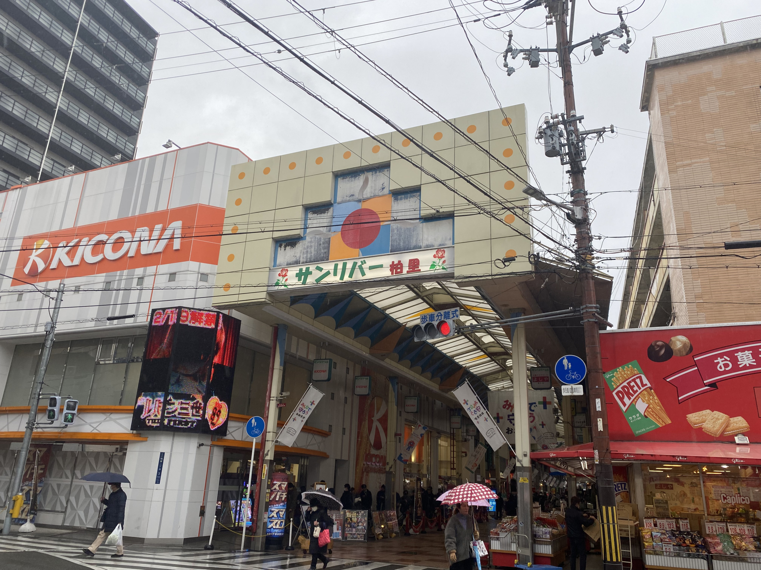 1.JR塚本駅西口を出て左前にある商店街(サンリバー商店街)へお入りください。